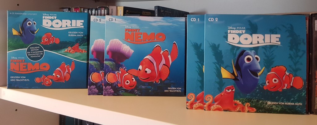 Ich bekam nur am Rande mit, dass Dorie eine eigene Geschichte bekommen hat. Über diese Hörbuchbox hatte ich die Möglichkeit, auch diese kennenzulernen. Zu meiner Überraschung verlief sie ganz anders als ich dachte. Gleichzeitig hat mir die Grundidee sehr gut gefallen. In typischer Dorie-Manie ist es ein wildes Hin und Her. Alte Bekannte aus dem ersten Film tauchen auf und neue Freunde werden gefunden. Oder sollte ich besser wieder gefunden sagen? Der Verlauf ist mit vielen aufregenden Szenen gespickt und für alle drei wird es ganz schön kompliziert. Richtig schön fand ich, dass Marlin endlich lernte richtiges Vertrauen zu haben, obwohl es ein wahrer Kraftakt ist. Doch wichtiger ist Dorie. Ich konnte über ihr zielstrebiges Handeln lächeln und fand ihren unerschütterlichen Optimismus beeindruckend. Sie gab nicht auf, schien es auch noch so hoffnungslos. Sie ist trotz ihres löchrigen Gedächtnisses eine Figur, die man ins Herz schließen muss.
